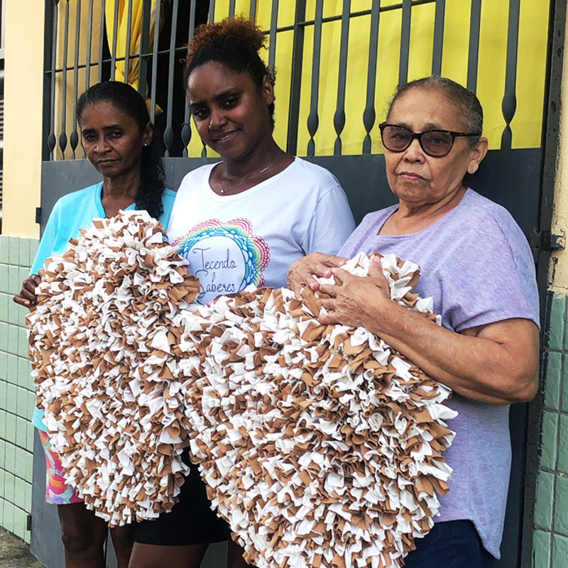30 mulheres, crocheteiras e costureiras que desenvolvem peças autorais e também sob encomenda. Encontramos elas através da ong NAVE que trabalha com vários grupos de produção de artesanato na cidade de São Luis no Maranhão, onde temos nosso ateliê. Atualmente elas são responsáveis por criar as nossas peças de retalhos que vão ganhar um espaço especial aqui no site.