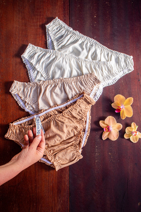 4 calcinhas em malha 100% algodão orgânico que já nasce colorido na cor cru e marrom, cultivado na Paraíba.